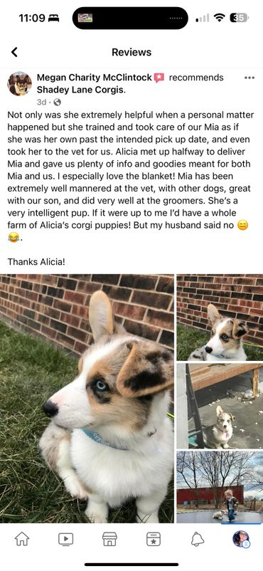 Another important factor in our program is proper and safe socializatio. This starts at day one in my home. Our pups are handled daily and loved on. Once they start getting a bit bigger and can see and hear we start introducing our adult dogs to the pups, this includes a Saint Bernard who is obcessed with snuggling our sweet babes. Once we’ve had our first set of shots we get to go play! This means the pups are introduced to the outside world. They’ll get to meet a couple other approved dogs and see cows and the neighbors horses. We do not train to herd! While corgis are a herding breed and do have the instinct to herd I personally do not train them in herding. At this time we also start to get to meet new people out side of my home. I take the pups to stores that allow them as well as nursing homes. While we are out and about in town, the pups are NEVER allowed to touch the ground.
